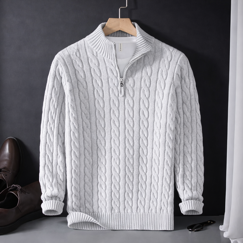 A refined essential designed for effortless layering. The Cable Knit Quarter Zip features a classic cable-knit texture with a structured stand collar and smooth quarter-zip closure. Crafted from a soft, mid-weight knit, it offers warmth without bulk and a timeless silhouette that transitions seamlessly from casual to smart-casual wear.